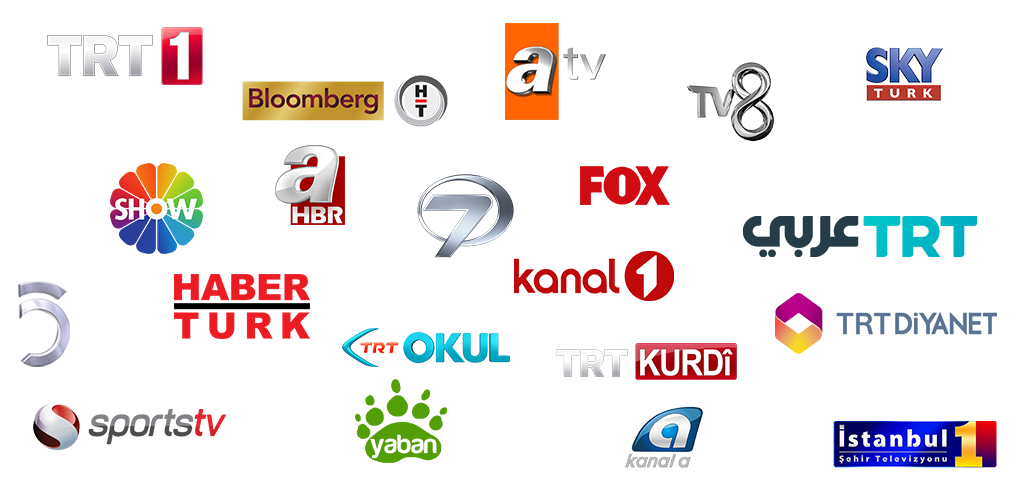 TRT 1, TRT Okul, TRT Diyanet, TRT Kürt, TRT Arap, Habertürk, Show TV, ATV, A Haber, Fox TV, Kanal 7, TV 8, Bloomberg HT, TV 5, Yaban TV, Kanal 1, Kanal A, Skytürk, Sports TV, İBB İstanbul...
